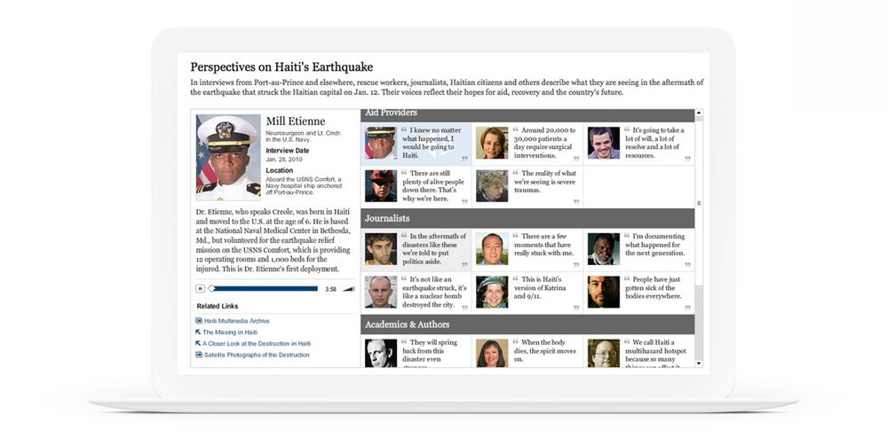 One of my favorite soundboard examples is the Perspectives on Haiti's Earthquake package by the New York Times. Unfortunately, the project is no longer available (RIP Flash Player), but it was a fantastic example of audio soundboards for learning.