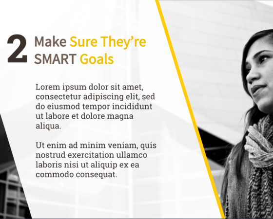 Here's an elegant black and white-themed template with vibrant yellow accents. It uses the built-in Office "yellow" design theme so you can easily customize it to suit your branding.