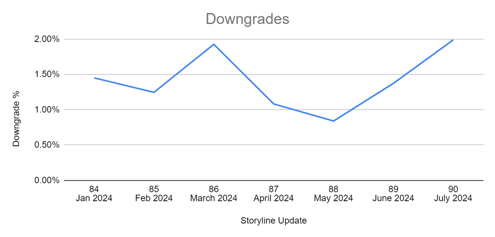 Storyline 360’s downgrade percentage for updates 84 through 90.Line chart depicting the Storyline downgrade rate from update 84 through update 90. The Y axis is the downgrade percentage and the X axis is Storyline updates.