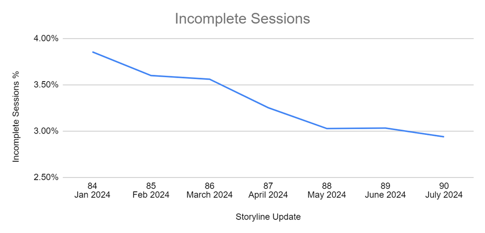 Storyline 360’s incomplete session percentage for updates 84 through 90.Line chart depicting the Storyline incomplete sessions from update 84 through update 90. The Y axis is the incomplete session percentage and the X axis is Storyline updates.