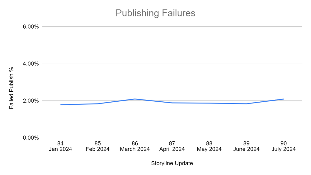 Storyline 360’s publishing failure percentage for updates 84 through 90.Line chart depicting the Storyline publishing failures from update 84 through update 90. The Y axis is the publish failure percentage and the X axis is Storyline updates.