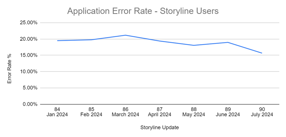 Line chart depicting the Storyline application session error rate from update 84 through update 90. The Y axis is the error rate percentage and the X axis is Storyline updates.