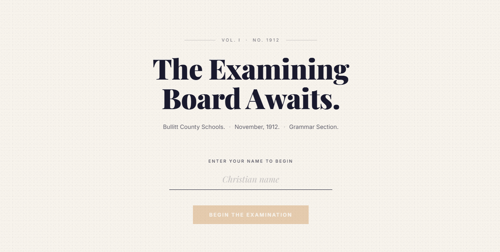 It starts by asking for your Christian name. Not your name. Your Christian name, because that is what a 1912 Kentucky schoolmaster would have said. That one detail sets the tone for everything that follows. The examiner knows your name and isn't shy about using it. The margin notes are handwritten and pointed. The feedback is sarcastic, whether you are right or wrong.