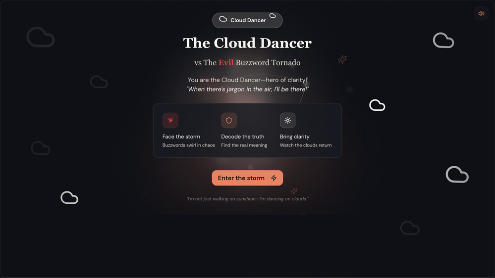 I really like your little animations for the clouds, and the audio is a great add. Great look and feel, and the interaction is engaging. Knocked it out of the park.