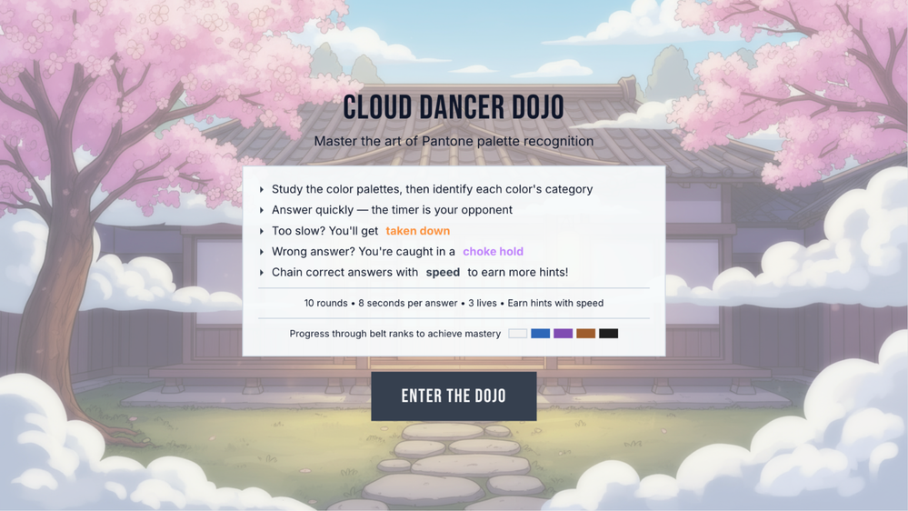 Learners try to match the correct color to the associated Cloud Dancer Pantone Palette; as they progress, they earn a higher belt rank. Providing a quick, correct answer awards extra hints that you can use to make your journey easier.