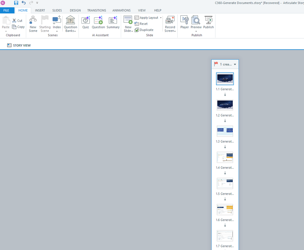 Hi everyone. I wondered if anyone can help me with the 'default' view that shows when I open Storyline 360, please. I can't pin the Story View to the LHS of my screen, to scroll through the slides. Instead, I have either the Story View in the middle of the screen (pictured) or individual slides to work on.