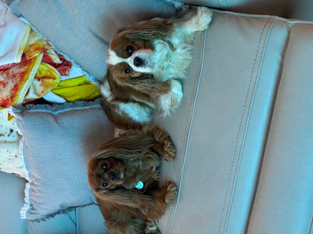 I have one dog at home and while I don't have any pictures of her handy, she's a 12-year-old doberman/golden retriever mix who is an 80lb lap dog (whenever she can get away with it).