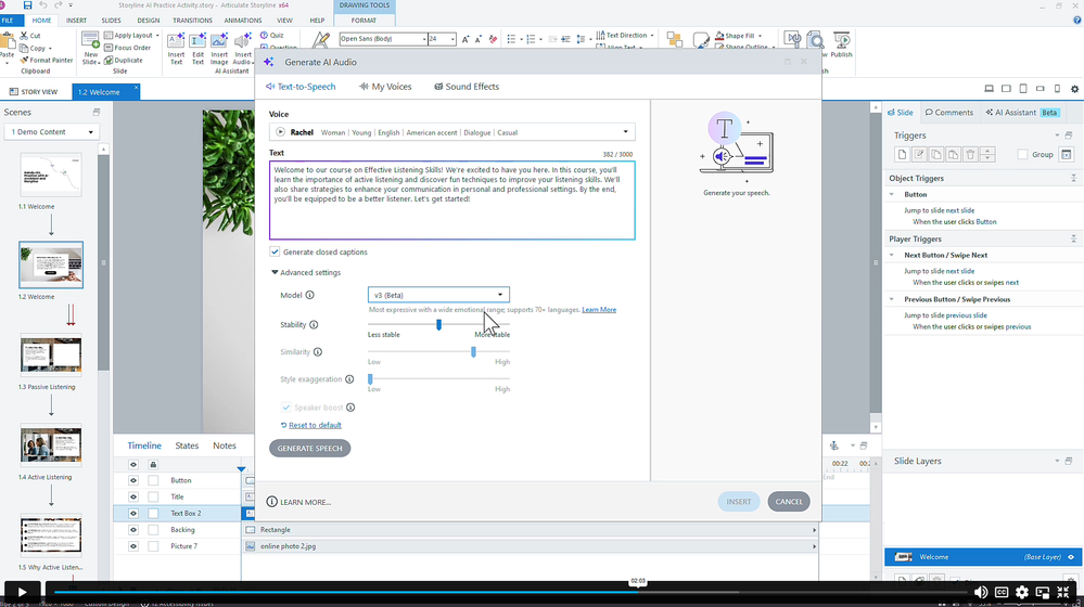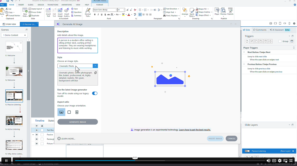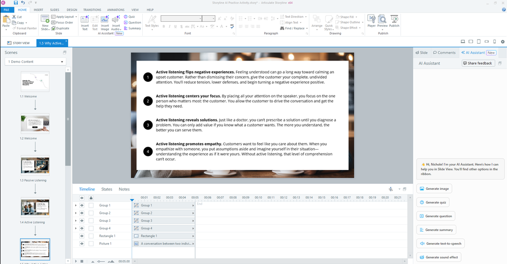 This has been great! I do have one question where my screen does not match the AI Assistant in the videos. I'm working on the practice for Storyline. I'm on the activity of using the AI assistant to add animations, and I'm not seeing where I can free text in to prompt the AI Assistant. I only have pre-populated suggestions like generate image, voice to text, etc. Did anyone else experience this?