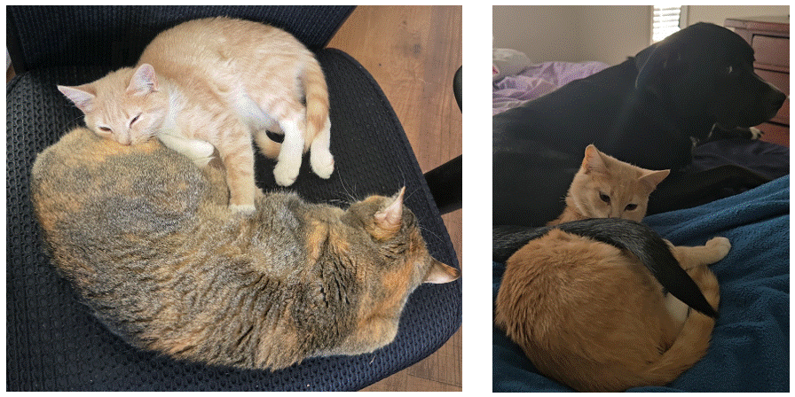 I have a black lab named Bodhi and a calico cat named Ember. We recently rescued an orange kitten named Niko who is trying desperately to become best friends with the others!