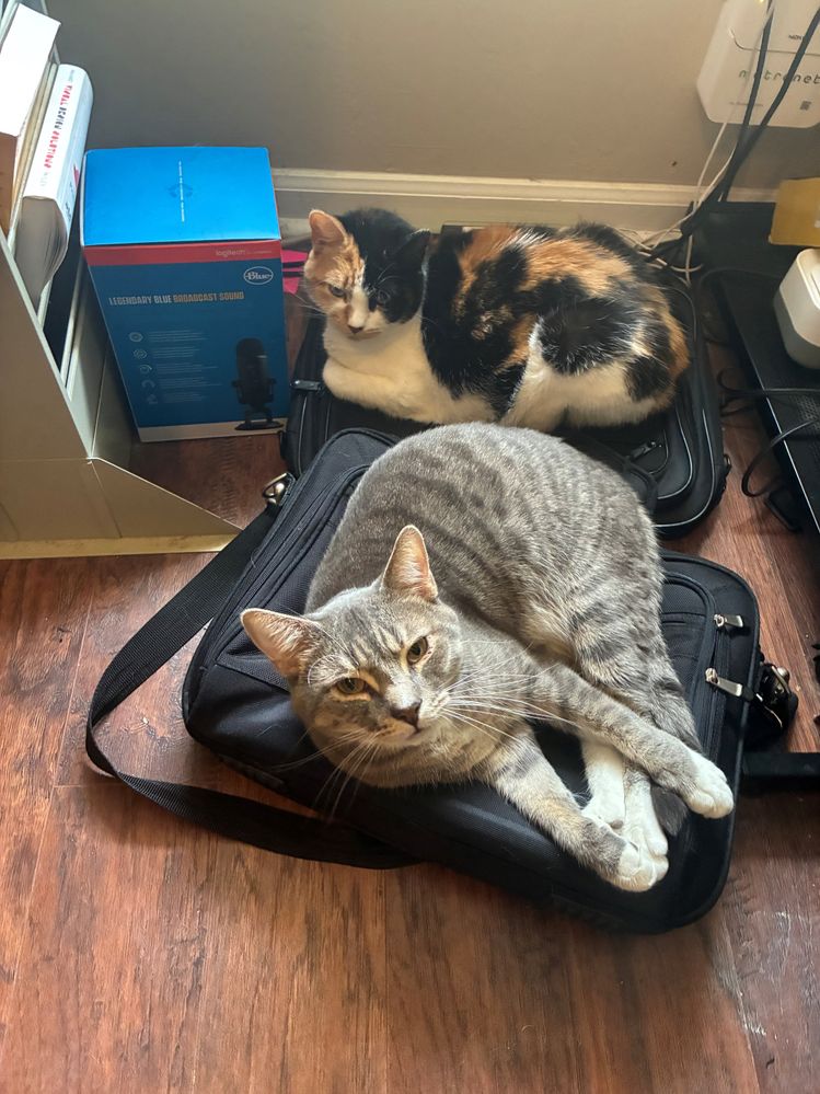 Hi April - I see the cats help keep track of your laptop bags!