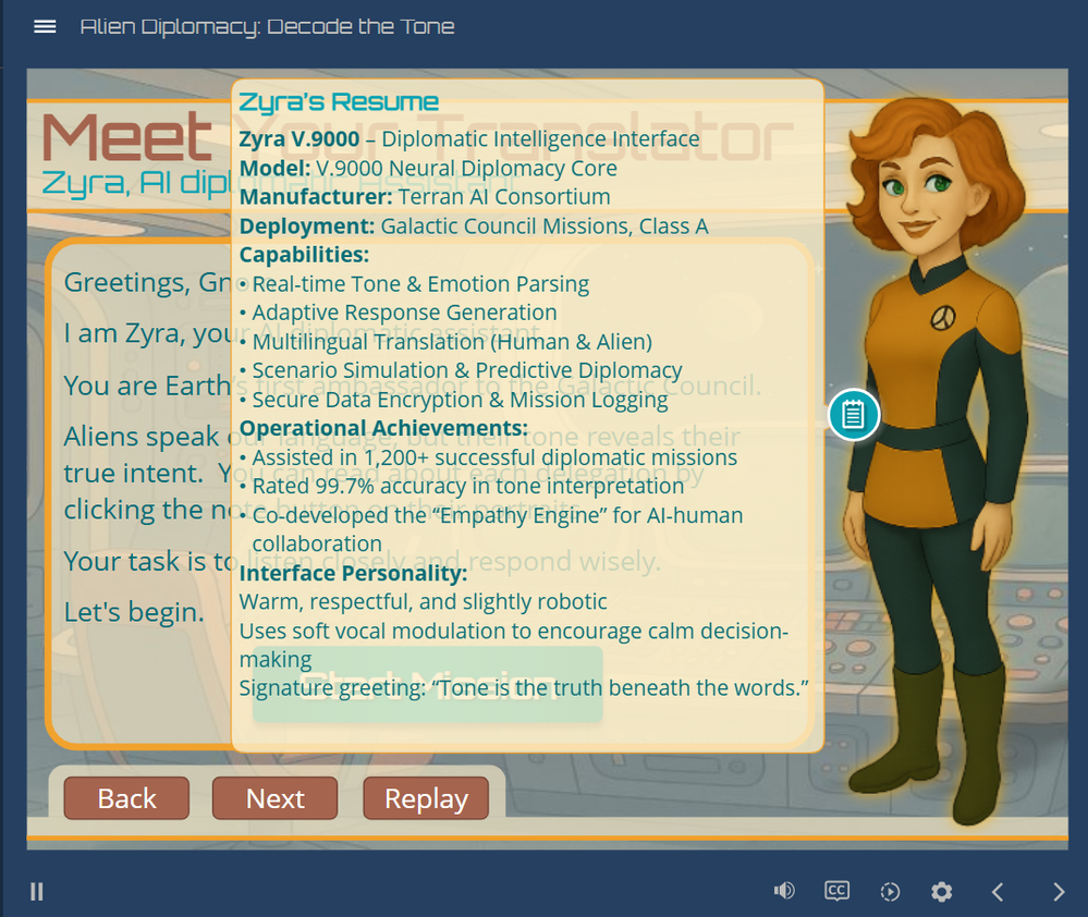 *Unfortunately, I don't have access to Storyline AI assistant, so the audios for Aliens delegation were generated using https://luvvoice.com/ program, which is user friendly, but with limited abilities for tones.