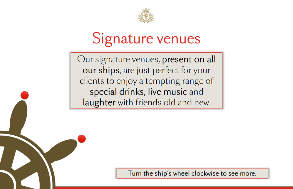 Since I develop Travel Advisor training courses for a storied cruise line, I thought a ship's wheel (well, an old-timey wheel) would be perfect for a dial to page through our ship's signature venues. Animating the dots was a bit of a chore (lots of triggers), but I like the way it turned out.