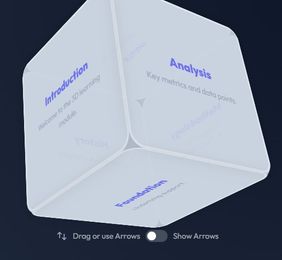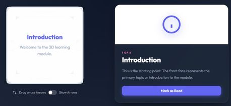 3D Cube Interaction LayoutLearners can rotate a 3D cube (by dragging or using arrow controls) to move between faces. Each face represents a topic, and selecting one updates an info panel with supporting content and a Complete button. Once completed, a checkmark appears directly on the cube so learners can easily track what they’ve already explored.