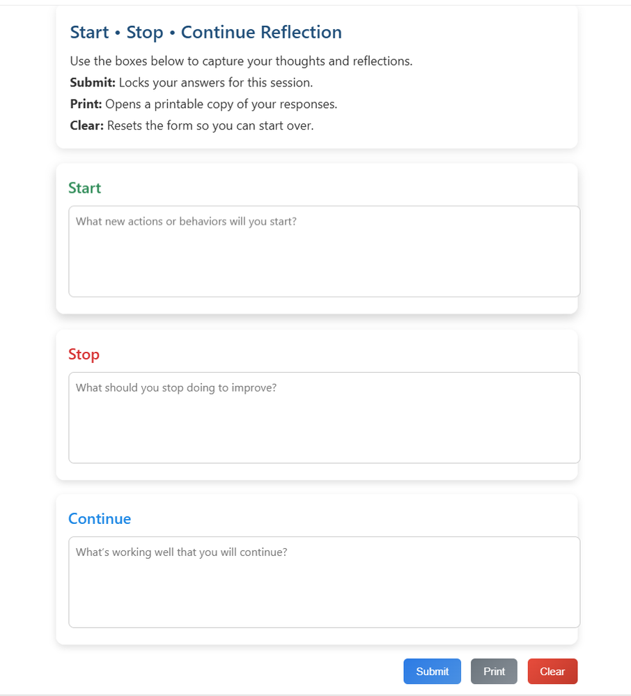 This version enables learners to type directly into the Start/Stop/Continue cards, select Submit to lock the answer in, Print takes to a print-only page and Clear to clear out their answer so can reuse the activity (I was also seeing the answers when I left preview and went back to edit. This fixed that).