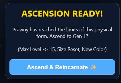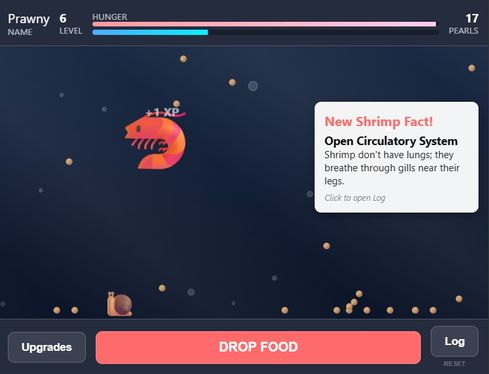 The pet tank introduces simple auto-clicker mechanics like upgrades and ascension—resetting progression while unlocking more facts, a higher max level, and even a new shrimp color. Learning is intentionally paced as a reward for playing, rather than something delivered all at once.