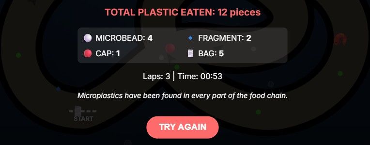 Hitting plastic fills a “plastic meter,” and once it’s full, the shrimp dies. When that happens, the interaction surfaces a quick fact about ocean plastic, reinforcing the theme without interrupting the flow of play too early.