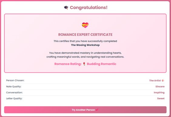 Valentine's Express is an interactive experience where users navigate through personality-based scenarios and craft handwritten notes and love letters. They choose a personality type (The Dreamer, The Artist, The Intellect, The Adventurer, or The Kindred Spirit), then receive personalized feedback as they write.