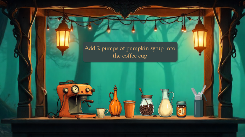 Welcome to The Hollow Grounds Café, a quirky drag-and-drop experience where learners take on the role of a night-shift barista brewing the season’s most haunted favorite — the Pumpkin Spice Latte.