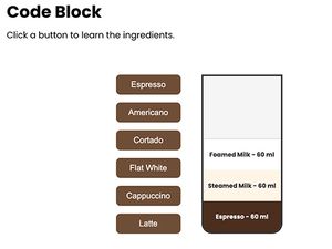 What a clever design! Thanks for sharing your work in the community and your thoughts on our new Code Block feature, which is in beta. I've shared your insight with our product team, as this is still under development. I'm sure all the big coffee fans will appreciate this interactive visual for each style of drink!