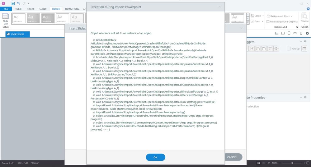 I got this message when I'm importing a PPT into a Storyline file: "object reference not set to an instance of an object".