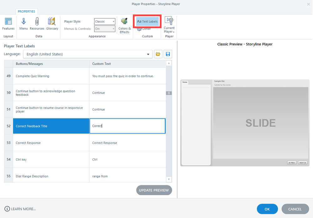 Follow up question: Is there a way to change the placeholder text that loads for the built in Feedback text ("That's right! You selected the correct response.") and Feedback title ("Correct")? It seems to override anything else I input from the Feedback Master.