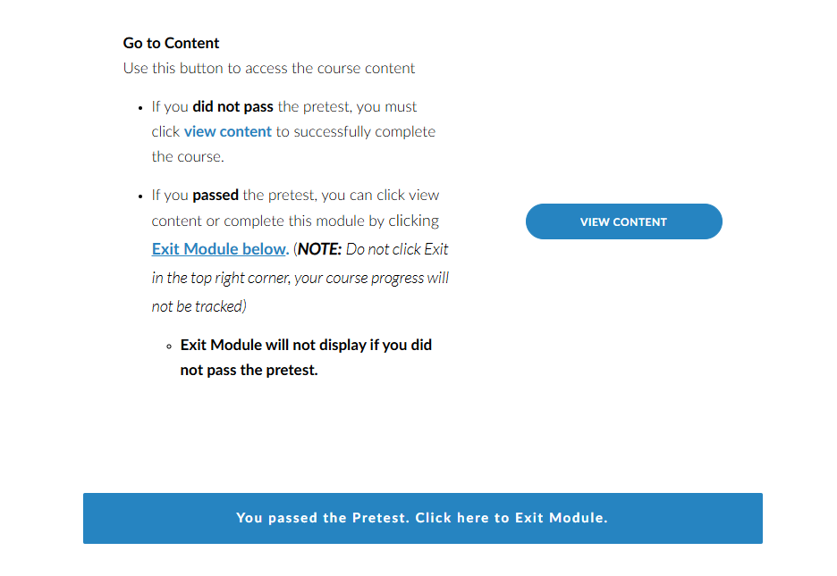 However, we have people who are taking and passing the pretest who still want to review the course content. So they are clicking the View Content button shown here, but not clicking the continue button to trigger the Storyline block showing course completion.