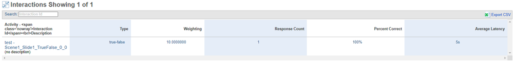 Each question slide interaction is assigned a unique ID to distinguish the response from other interactions. By design, each question slide can only send a single interaction response to an LMS, which typically shows up in LMS reporting like this: