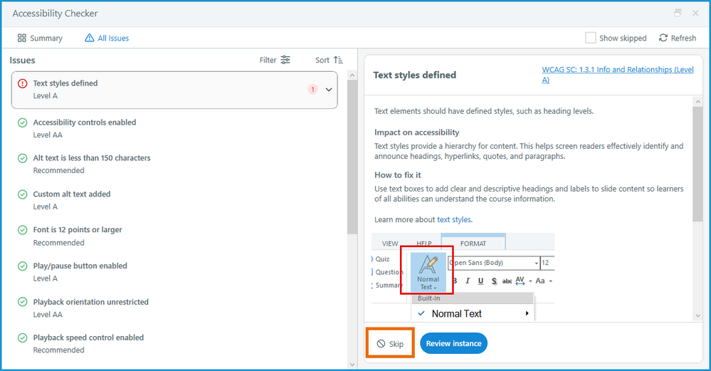Option 1: Click "Skip" in the accessibility checker.