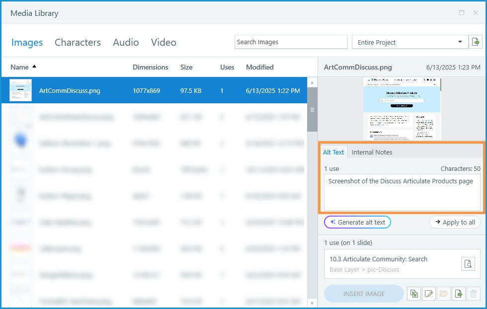 The most efficient way to add alt text depends on how many images are in the course and on personal preference. You could do it as you develop each slide, do it at the end, or do some combination of the two.