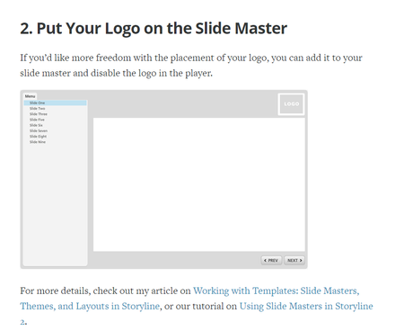 Take a Peek at this demonstration I recorded for you! As you'll see in the video, the logo is part of the slide master (not part of the player itself). This technique gives you lots of customization options.