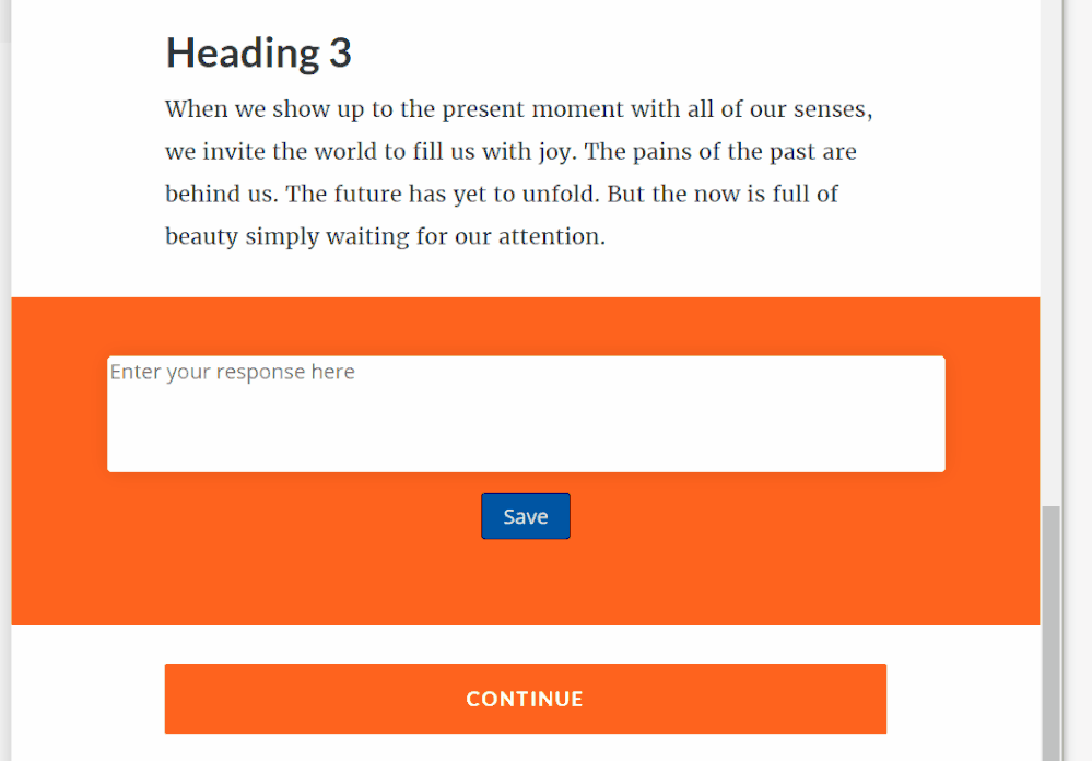 Even just adding a way for learners to type their own reflections into a box before the continue button appears would be wonderful (without passing the text to the LMS). A basic text entry box. Please?