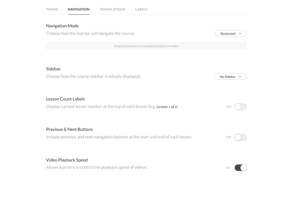 I do not want my students to be able to navigate freely using the sidebar, so I have that options set to "Closed."