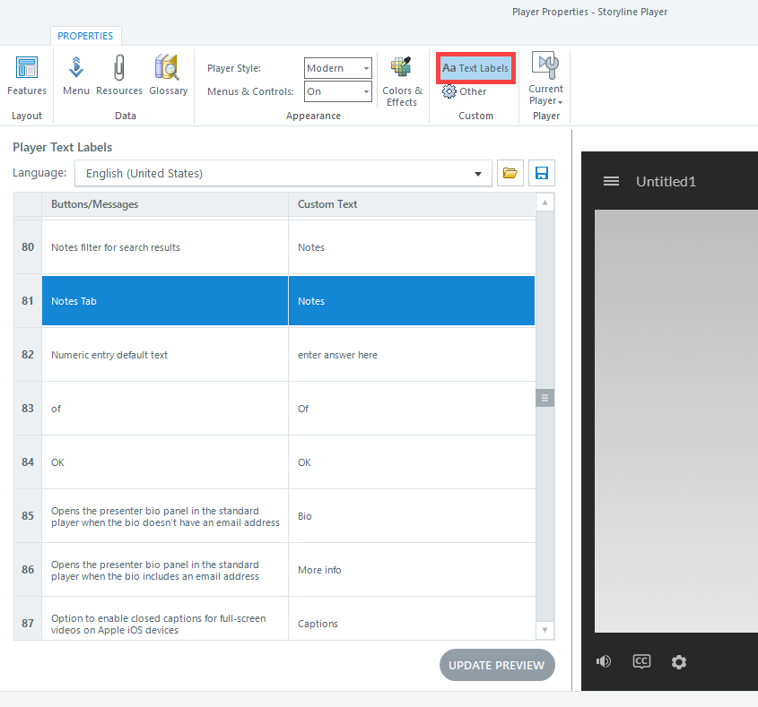 You can relabel the Notes tab by editing the Text Label in the Player.