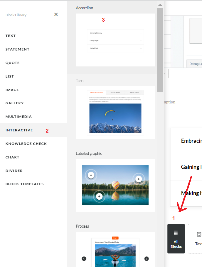 Please click on All Blocks>Interactive>Accordion. Here's a screenshot: