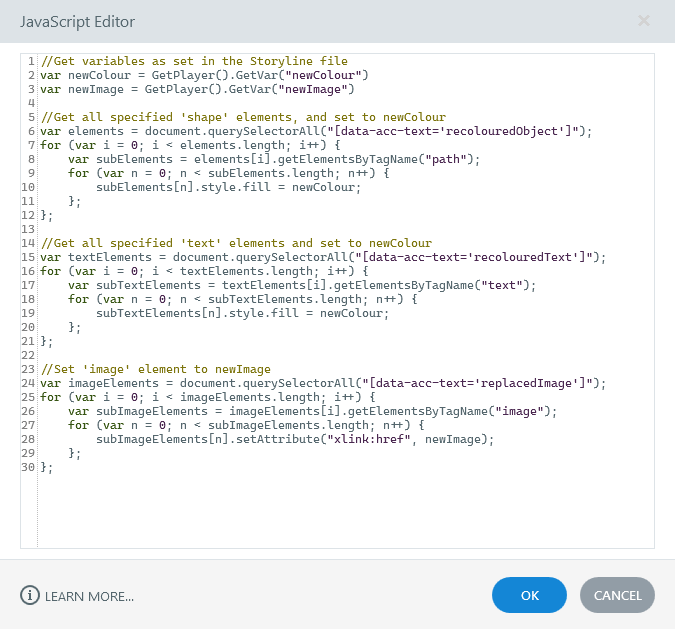 I am trying to customize my courses by changing colors and images based on variables. I am passing the color codes and image names into the course and using javascript to transfer those pieces of information to storyline variables.