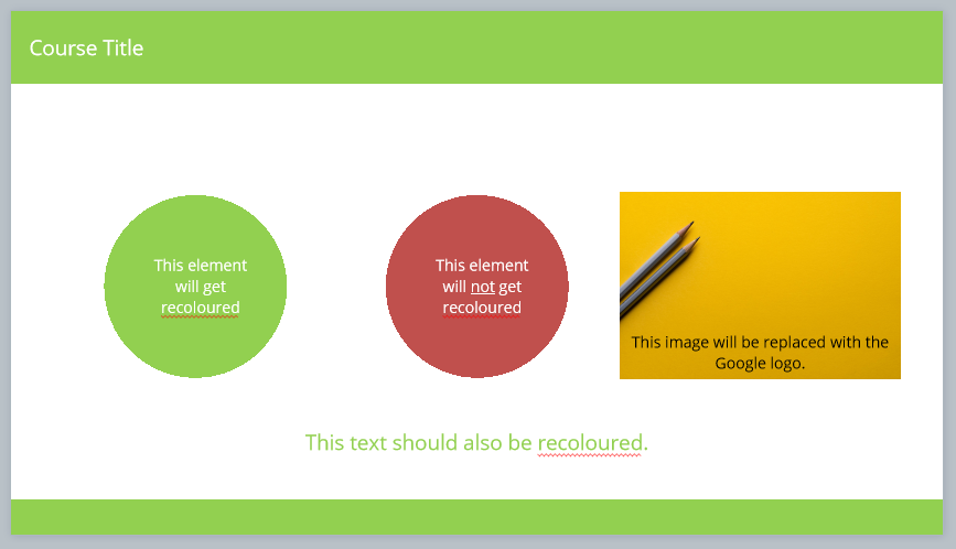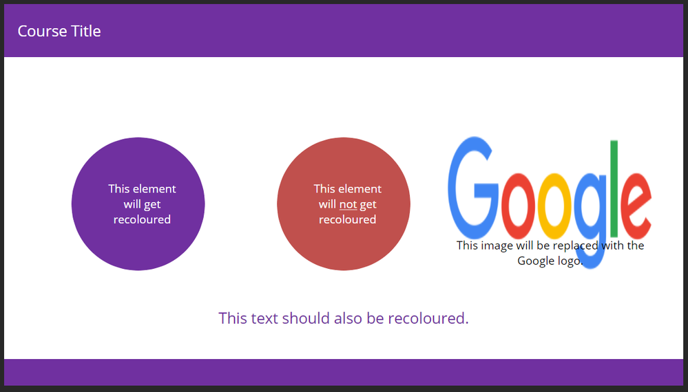 I cannot figure out how to change the colors of text or shapes to the values of the variables. Maybe this is not possible. I was hoping that I would be able to change the default palette using javascript so that the new colors would be translated throughout the course.