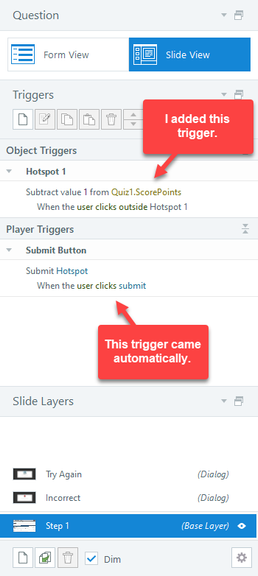 I also attempted to create a new variable which I called IncorrectClicks - but it doesn't impact the Quiz1.ScorePoints and I don't know if it is worth trying to add a trigger to the Quiz Results to show Success/Failure layers based solely on the IncorrectClicks variable (and removing the stock trigger to show layers based on ScorePoints).