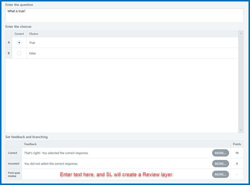 Note: During a review, Storyline automatically puts Correct and Incorrect banners across the bottom of the slide. Those can be hidden by covering them with shapes in the Review layer.