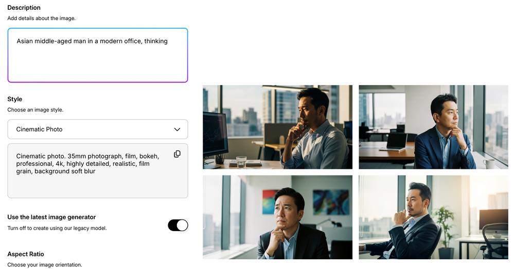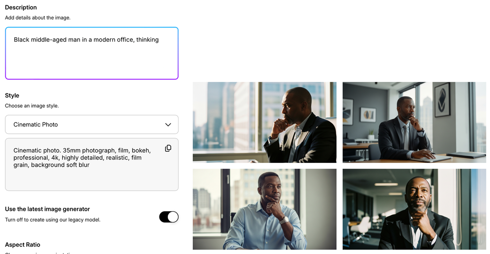 I've tried "diverse," "multicultural," "non-white" to generate an image of a middle-aged man thinking in a modern office, and I'm getting all but one white dude. I've already used a picture of a middle-aged white person and want to portray the diversity of my workplace, but this feature is not helping. I used similar prompts for the female images and had no issue. In the image below, you can see that the prompt is a "non-white middle-aged man in a modern office, thinking," created four white dudes. The AI needs some refinement regarding this issue.