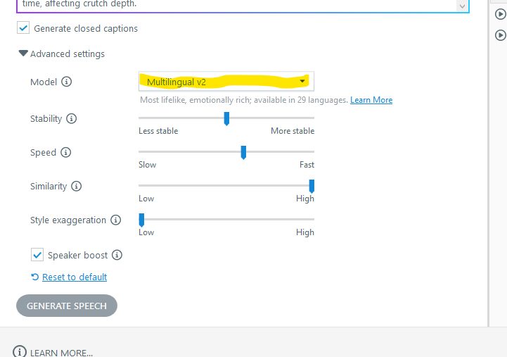 Under the voice Advanced Settings, I noticed it didn't look like it normally does. So, under model, I selected "Multilingual v2" - which shows the adjustable settings and is creating narration as I have come to expect. So, I suggest trying that to fix your second issue.- Stewart-SAP-PMCommunity Member