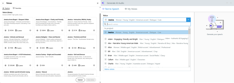 However, my concer in very spesific. The voice “Jessica — Woman | Young | English | American accent | Dialogue | Cute” that is available in Storyline does not appear to be available in Rise. While there are several other voices named Jessica in Rise, none of them sound the same as the one available in Storyline.