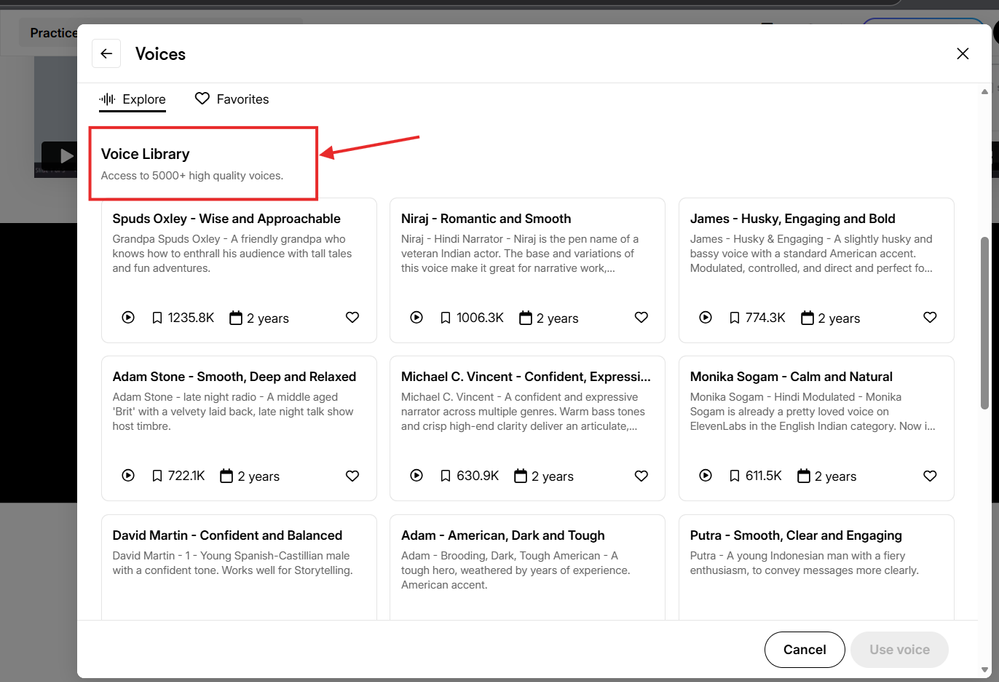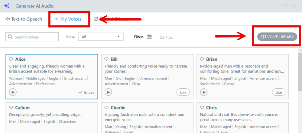You can find the library via the Generate AI Audio window, by selecting My Voices > Voice Library.