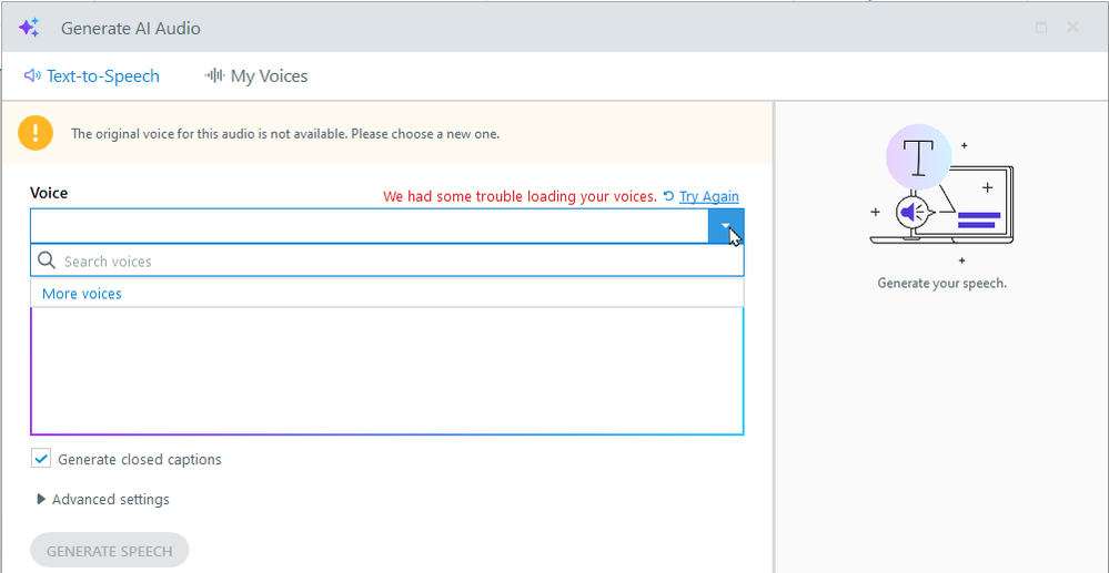 I'm having the same issue. They appear and disappear randomly. When they are available, the volume decreases over the time. At the start the volume is good and by the time you get to the end of the audio the volume is so low you can hardly hear the voice.
