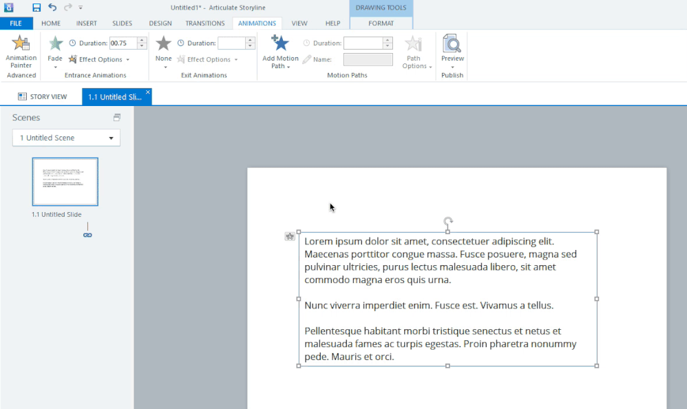 In Storyline 1 and 2 I could animate my text to display one paragraph at a time. Now, in Storyline 3, the path to do that through the Animation tab is no longer there. Does anyone know how this is done in the new version?