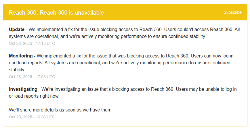 Hi CaraThomas-d02a! Reach 360 was unavailable earlier but it is now restored. Please let me know if you are still running into trouble with Reach 360!