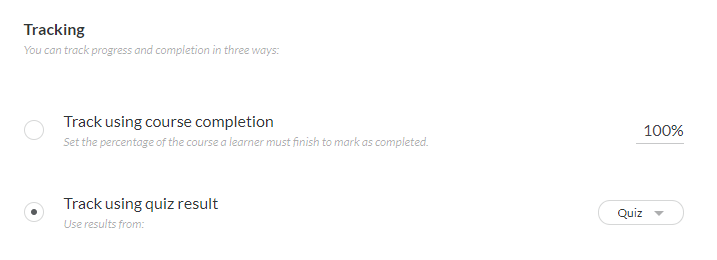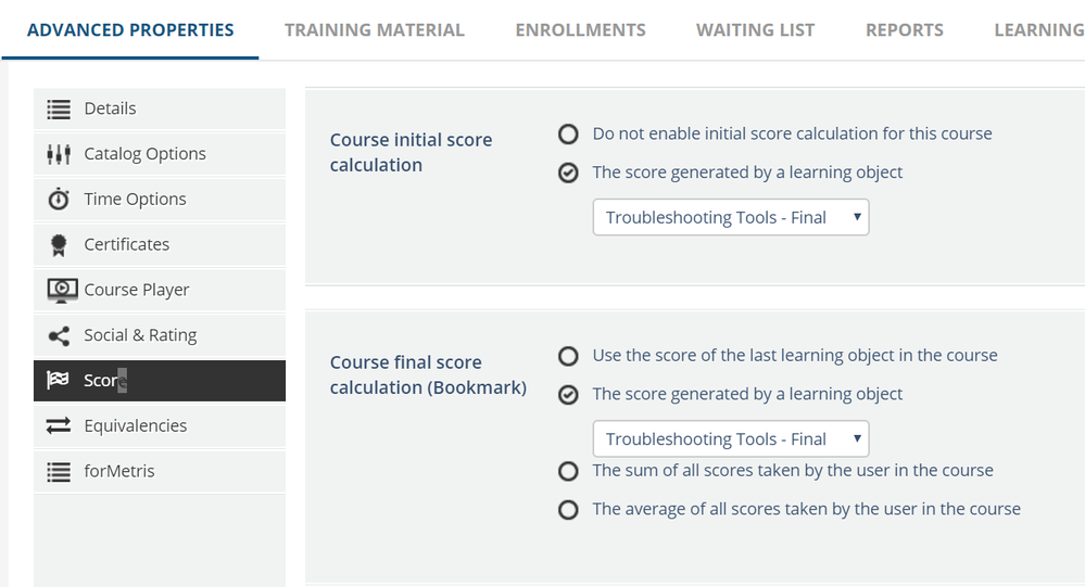 Since we are using Tracking using quiz result Docebo requires settings under Advanced Properties: