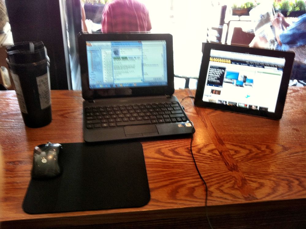 When I'm not at home I rock the portable dual monitors with a netbook and an iPad. This isn't a true dual monitor set up in the sense that I can move stuff from one screen to another but it serves me very well and allows me to be the multitasking fool that I am. Here I am working AND checking my Blockbuster queue.