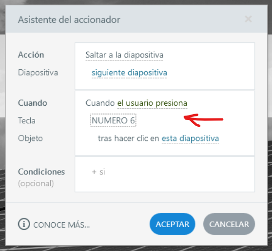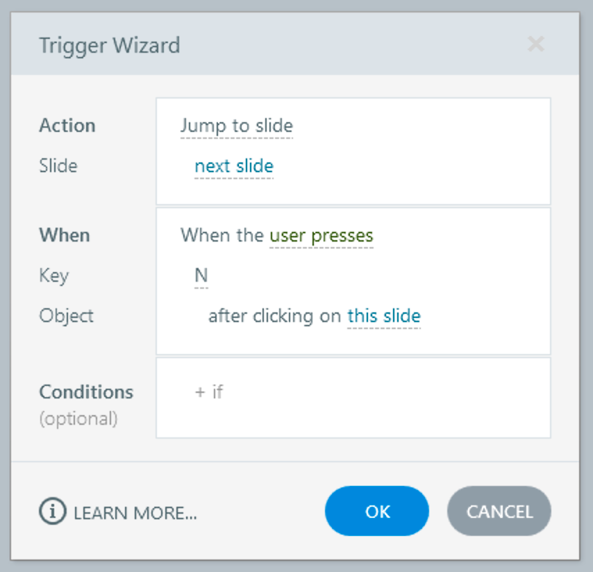 I'm trying to set it so it advances to next slide with a key, but the trigger options shows that it works only after the user clicks on and object which makes the whole point of using a keyboard to navigate redundant. Am I missing something? How do I remove the "after user clicks on..." condition?