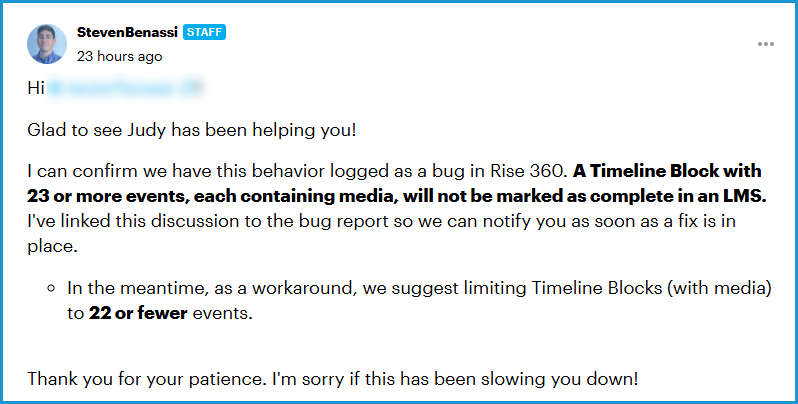 Coincidentally, I recently saw a StevenBenassi message that said there's a bug in the Timeline block. ( RISE Timeline Interactivity - Not Getting Completed | Articulate - Community ) The block doesn't complete if there are 23 or more events.