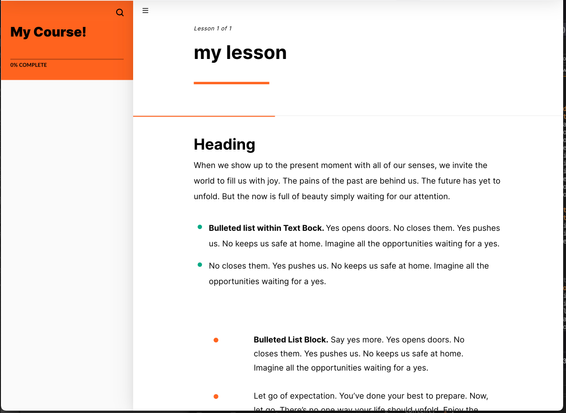 .nav-sidebar__body { display: none; }and looks like this on lesson pages. The user can still click course title in the sidebar to navigate back to the title/cover page, but sidebar navigation is hidden.